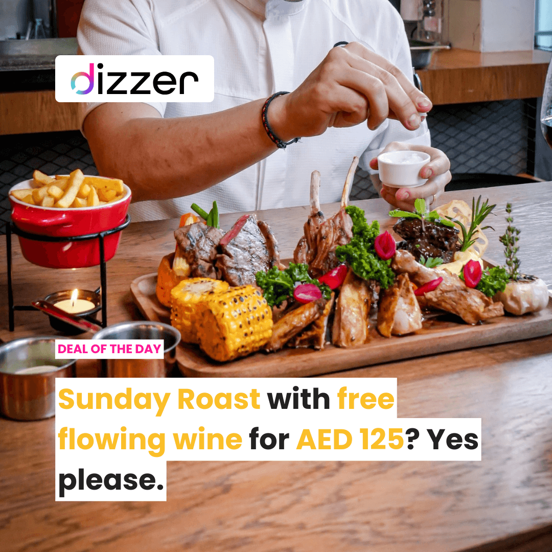 A roast dinner including a drink for around 125 AED is a typical price for Dubai, but this one includes unlimited wine, and we love a glass of wine (or 5) with our sunday roast.
